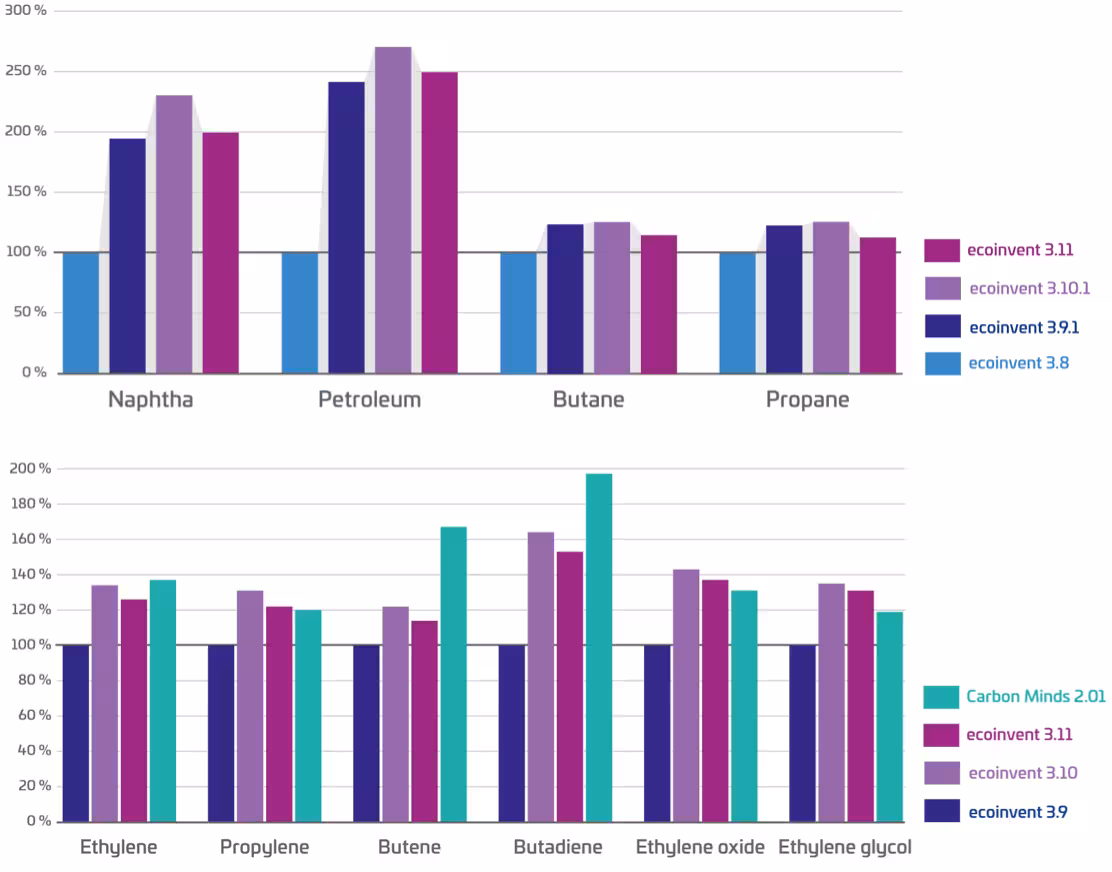 These data revisions mean that the carbon footprint of key fossil-based feedstocks and downstream products, as tracked in such LCI databases, has risen sharply over the past years, Figure 1. As a result, major petrochemical products have seen marked carbon footprint increases.