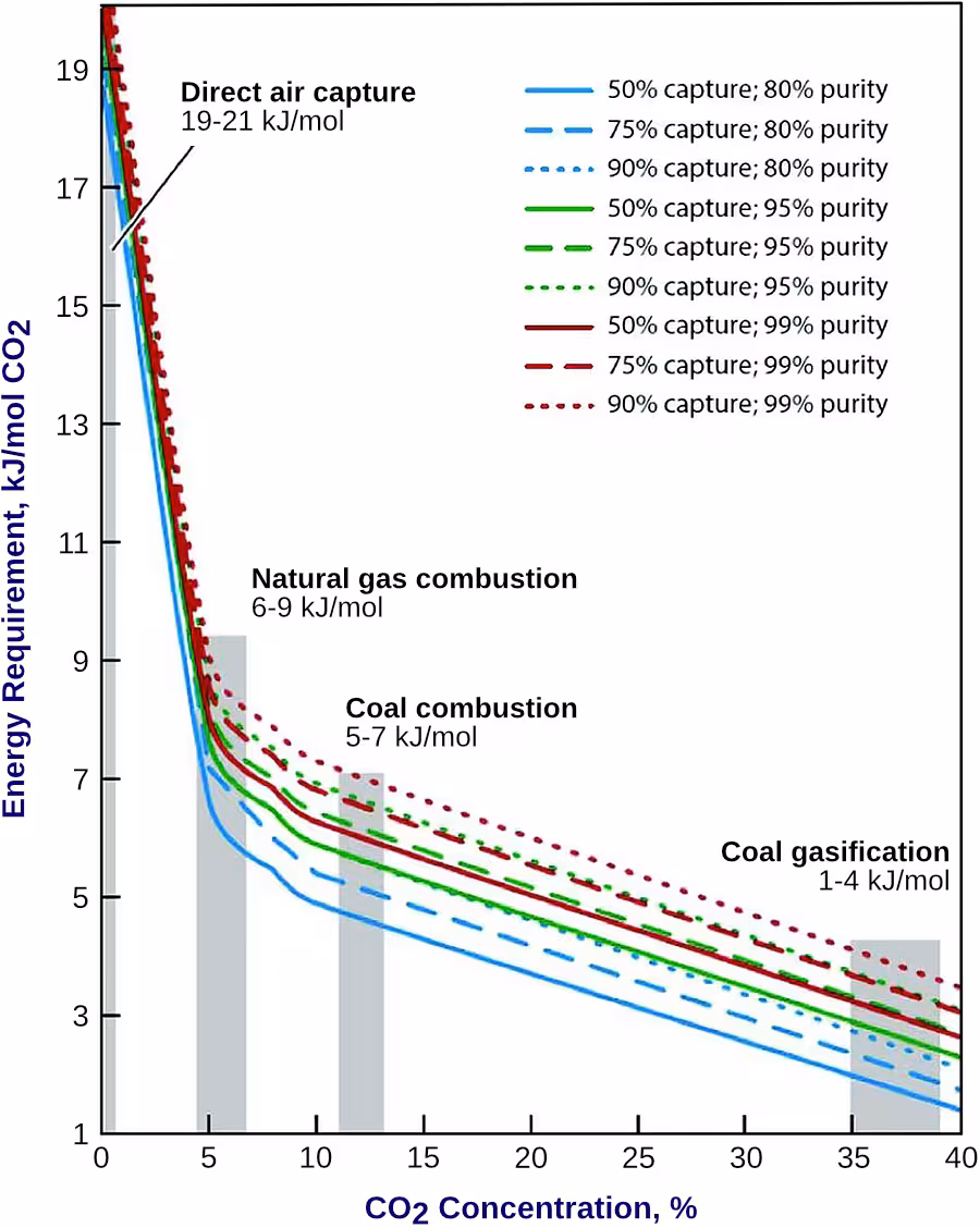 Additionally, the efficiency of a given separation process (i.e., the ratio of the theoretical minimum work of separation to the real work of separation) decreases with increasing dilution of CO2 concentration because the amount of unwanted or inert gas (mostly nitrogen) that needs to be processed increases [6537] [6538]. However, different processes can have significantly different second law efficiencies. Some of this difficulty can be overcome by using processes that are more efficient for separation of lower concentration CO2 mixtures. The second law efficiency of CO2 separation from several industrial processes where the CO2 concentration prior to separation ranges from 3.6% to 90% ranges from 11% to 25% [6539]. For capture of CO2 from the ambient air (direct air capture) where the CO2 concentration is about 400 ppm, the second law efficiency for many processes ranges from 5-10% [6540].